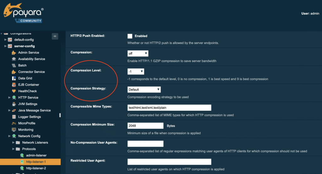 As of Payara Community 5.2021.7 (5.32.0 for the Enterprise Edition), two new fields are added to configure the compression level and strategy. The compression level determines the amount of compression. A value of 0 means no compression whereas 9 results in maximum compression. This is also a tradeoff for the impact on the server performance. A value of 0 does not impact the performance but 9 can have a noticeable influence on the response time.